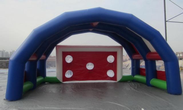 Este hinchable de gran tamaño con forma de medio campo, se encuentra completamente cerrado con redes para para que las pelotas con las que se tire no se vayan lejos y no sea necesario el tener que buscarlas todo el tiempo. En el fondo del hinchable se encuentra una portería con varios agujeros por donde se deben introducir los balones en un ejercicio de habilidad y puntería