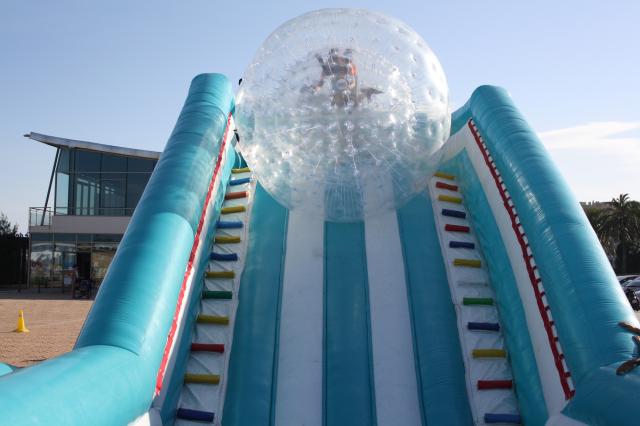 Características, es una montaña hinchable con una caída de 17 metros de largo. La bola de zorb ball tiene una entrada lateral para acceder a su interior y su interior es totalmente hueco.