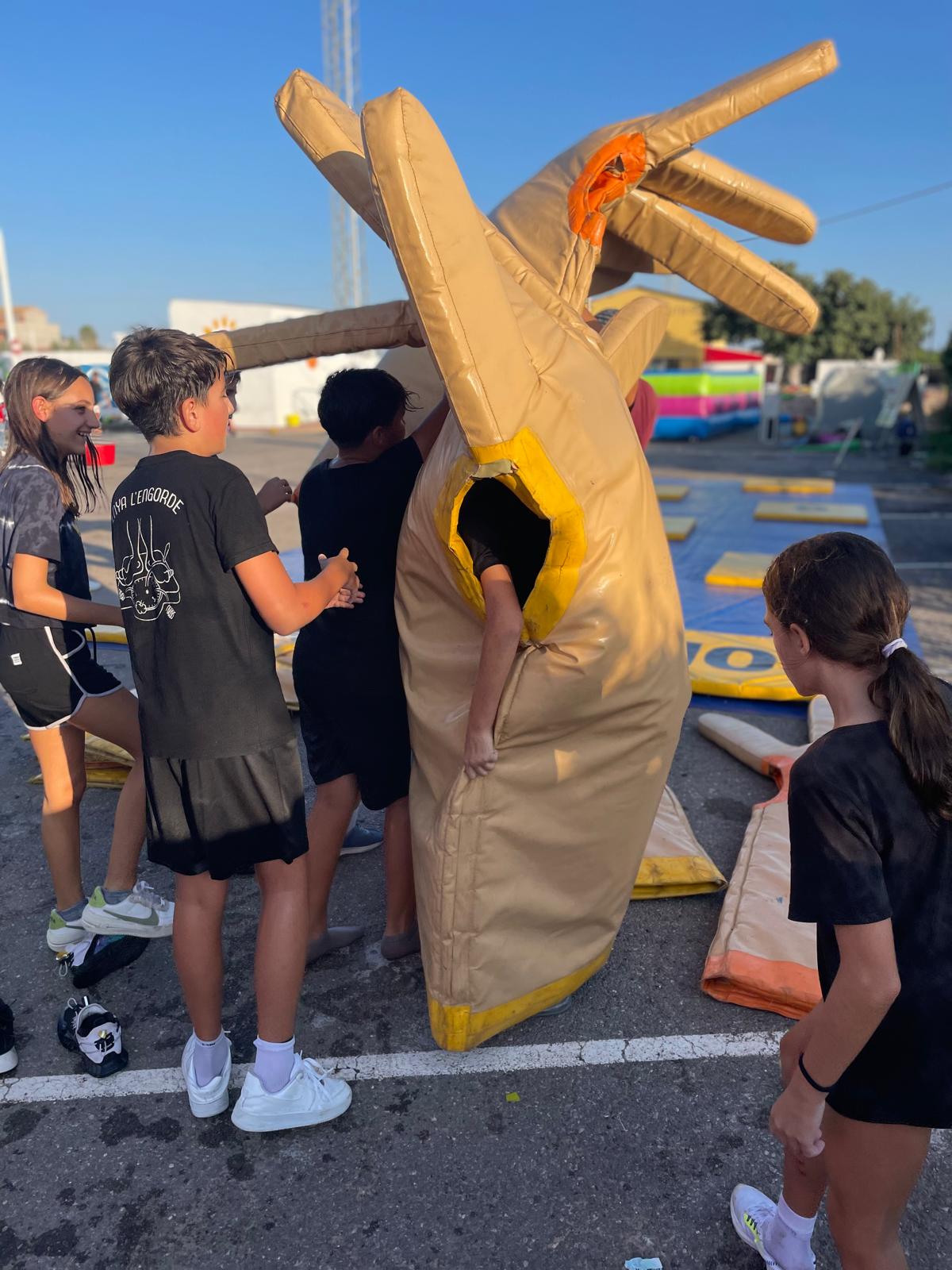 Los participantes, disfrazados con enormes manos de espuma, compiten entre choques y risas mientras el speaker lanza operaciones matemáticas al aire.